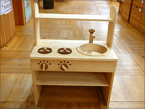 寸法:75×60×35(cm) 材料:マツの木(国産)おままごと用の子供サイズのキッチン流し台です。幼稚園程度の平均身長であれば、お子さんが立って遊べるサイズとなっており、蛇口・コンロのつまみは実際に回すことができます。